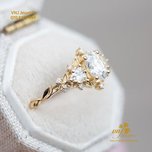 Viên kim cương tự nhiên được mài theo kiểu marquise độc đáo, với hình dáng thon dài, tựa như chiếc lá. Kiểu mài này không chỉ làm tăng thêm sự sang trọng mà còn tạo hiệu ứng lấp lánh đặc biệt khi bắt sáng. Những viên kim cương tấm hình tròn nhỏ, được đính xung quanh đá chủ, tạo thành một quầng sáng rực rỡ. Kiểu đính này giúp nhấn mạnh vào viên đá chính và làm tôn lên vẻ quý phái cho tổng thể thiết kế.