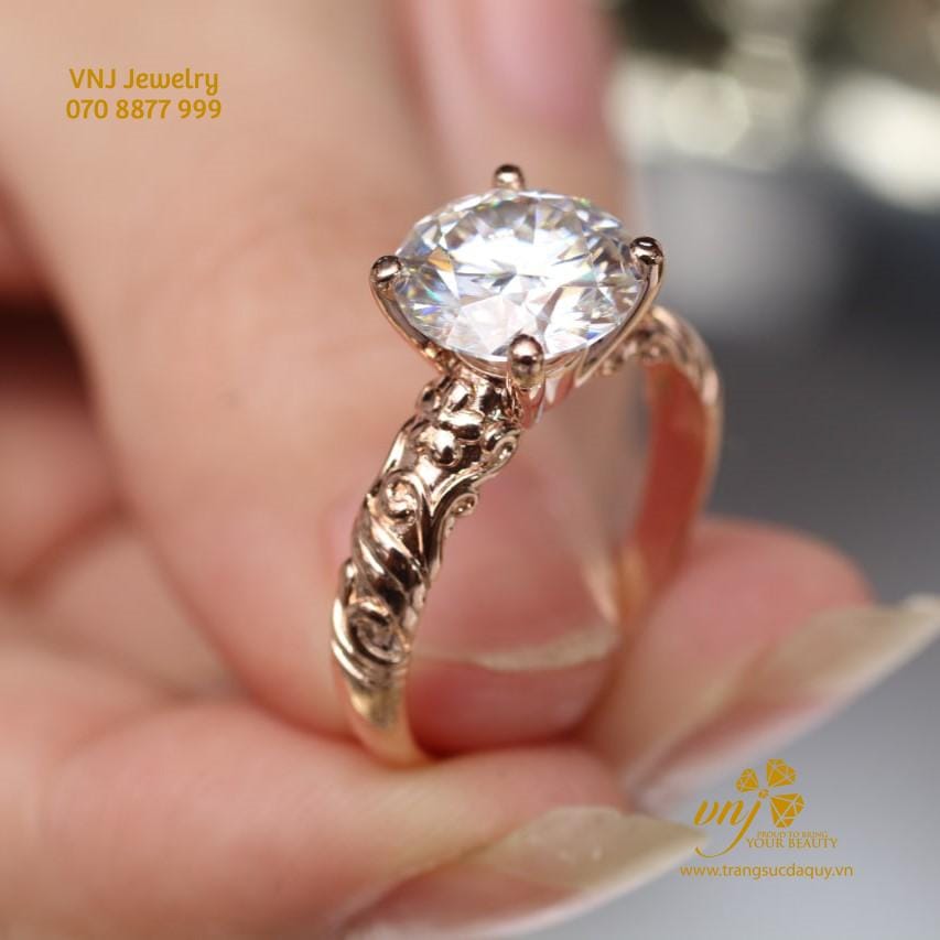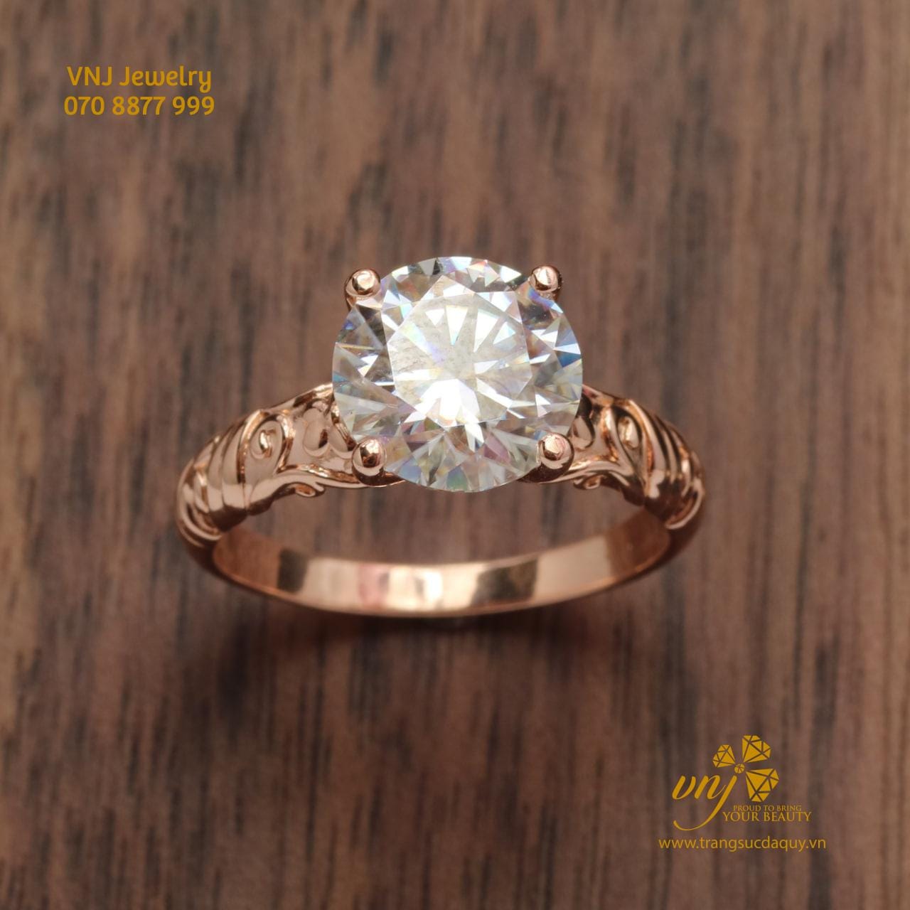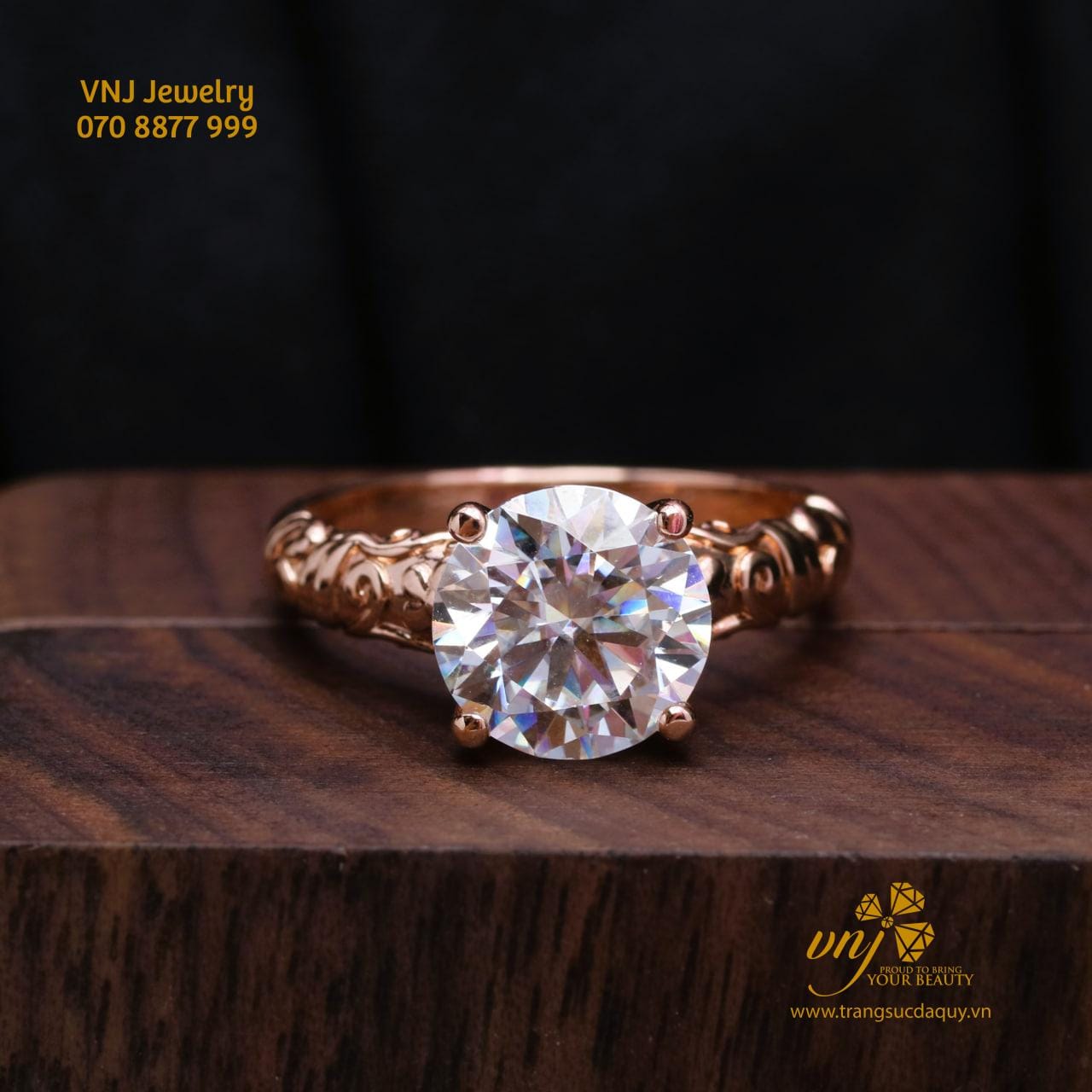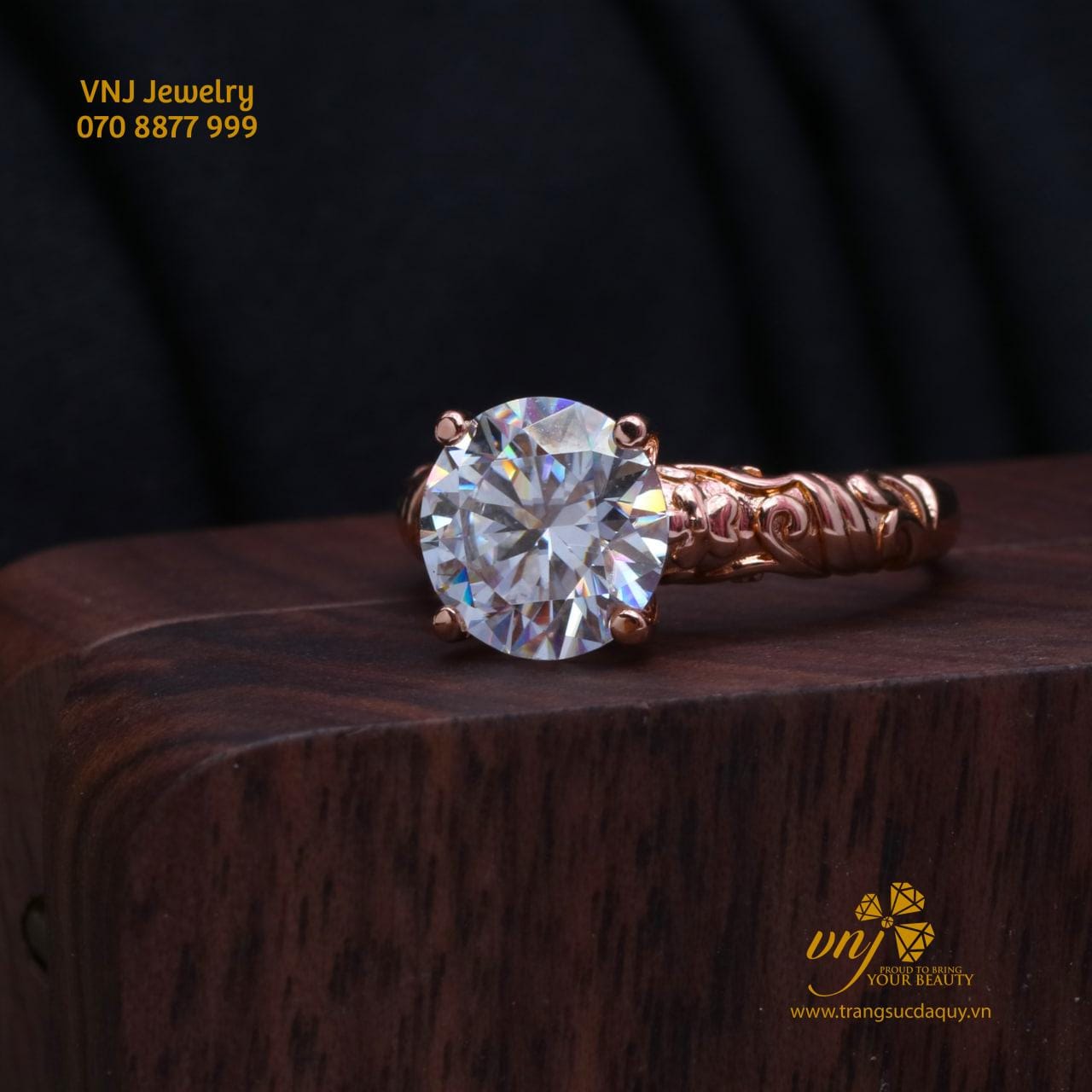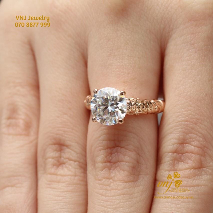 Nhẫn Kim Cương NWD34 sở hữu viên kim cương chủ lớn, dạng tròn với các giác cắt hoàn hảo, tỏa sáng rực rỡ ở mọi góc nhìn. Được đặt trên phần đai nhẫn vàng hồng độc đáo, kết hợp các họa tiết uốn lượn tinh xảo, nhẫn mang đến vẻ đẹp cổ điển đầy lãng mạn. Các đường nét chạm khắc mềm mại không chỉ làm tôn lên viên đá chủ, mà còn tạo nên vẻ thanh thoát và quý phái cho tổng thể thiết kế.