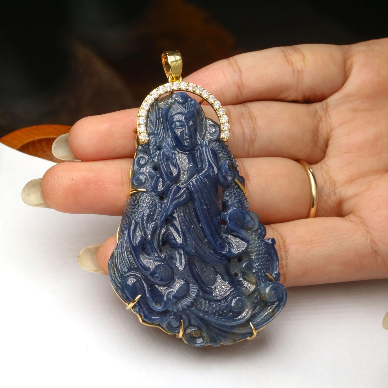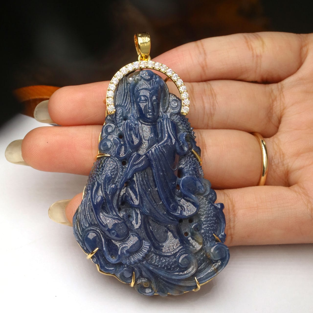 Tượng sapphire blue Quan Âm Bồ Tát xanh tự nhiên có vân huyết xen kẽ được VNJ chạm khắc tỉ mỉ, sản phẩm đã được giám định sẵn giúp bạn yên tâm về chất lượng sản phẩm